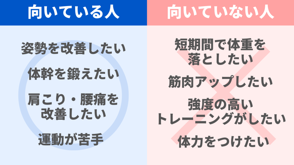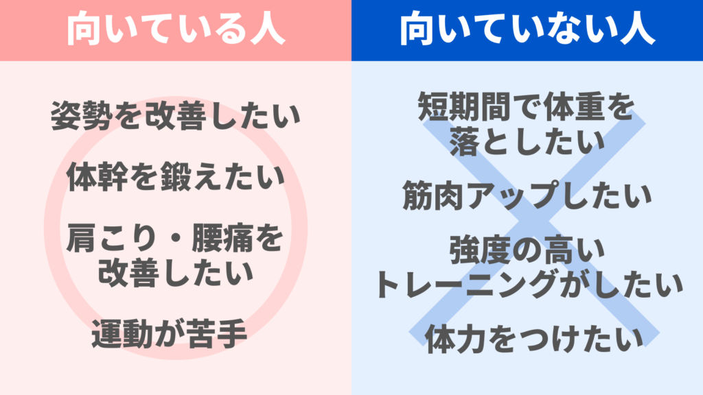 ピラティスに向いている人と向いていない人の特徴は、以下のとおりです。