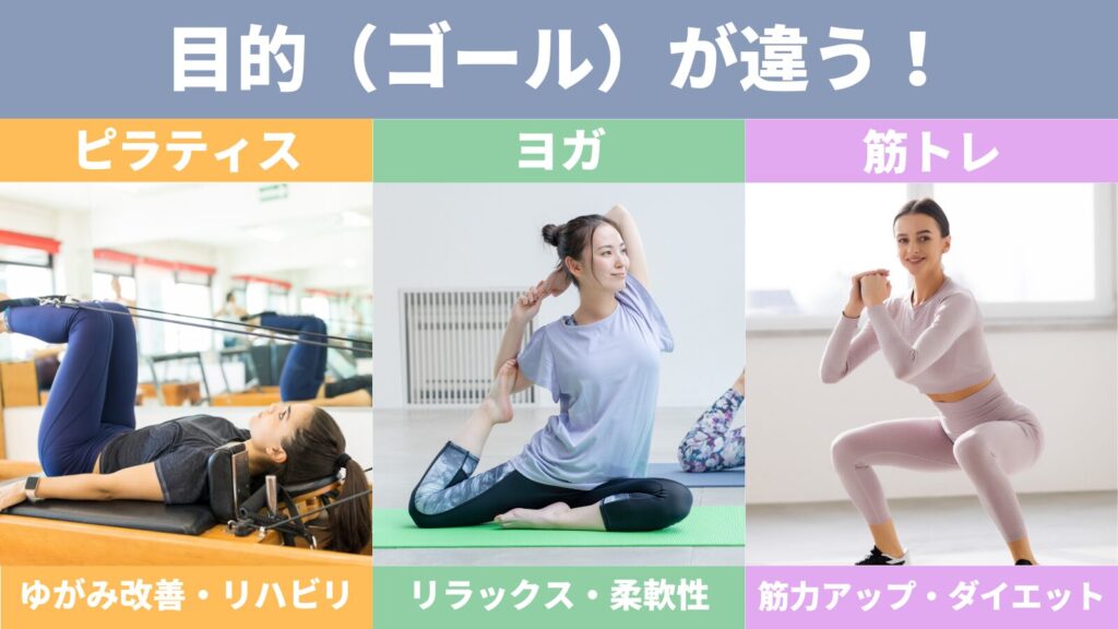 ピラティス・ヨガ・筋トレは、それぞれ目的(ゴール)が大きく異なります